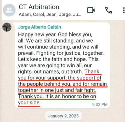 Fellow lawyer, Jean Paul Dechamps, controversially hired by Mr Gaitan but confirmed in position by the Tribunal ruling, added his own words “Hello team CT arbitration – hope you all had a great start to 2023. I fully echo Adam’s words – Carol and Jorge it really is a privilege to work with you …”