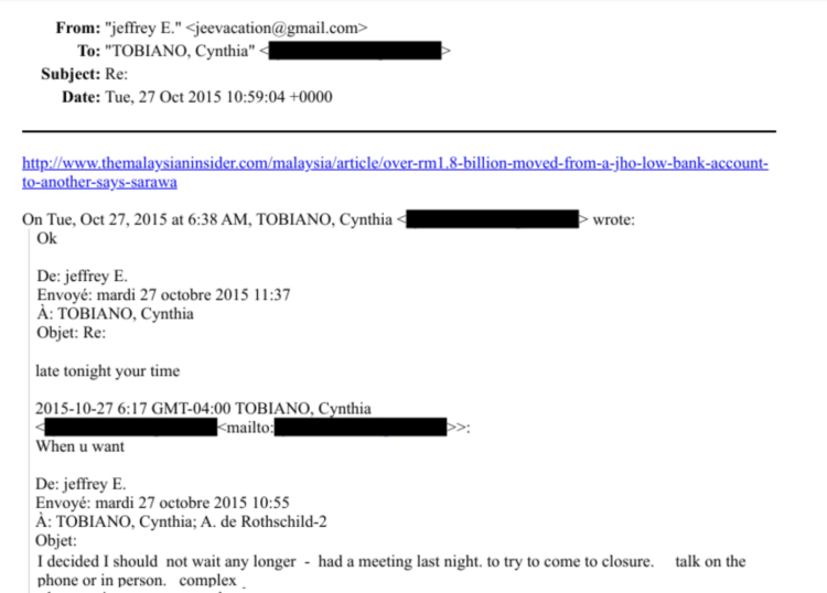 On 27th October 2015 Jeffrey Epstein arranged an urgent late night call with Cynthia Tobiano, the right hand deputy to the President of Edmond de Rothschild bank, Ariane de Rothschild, who was copied into the email exchange.